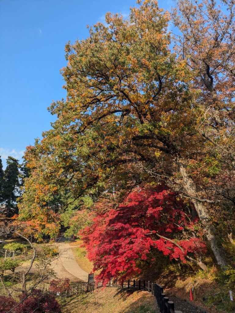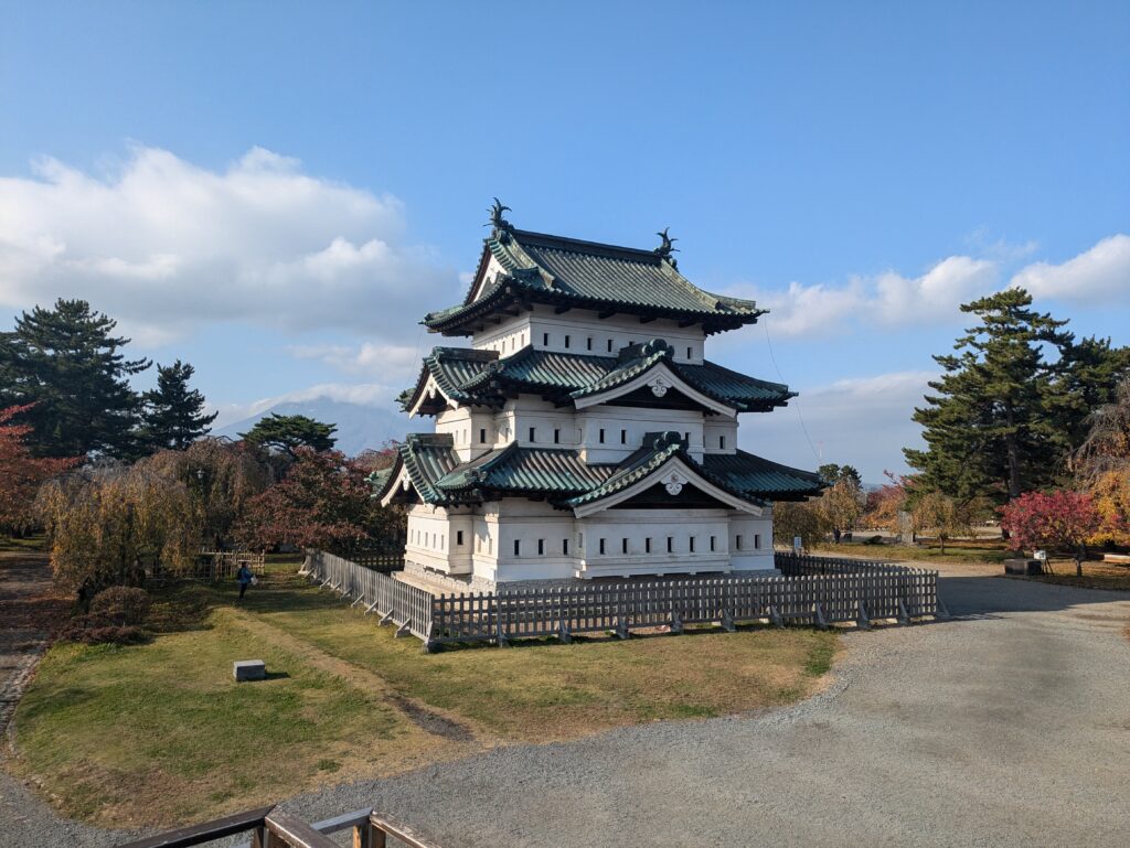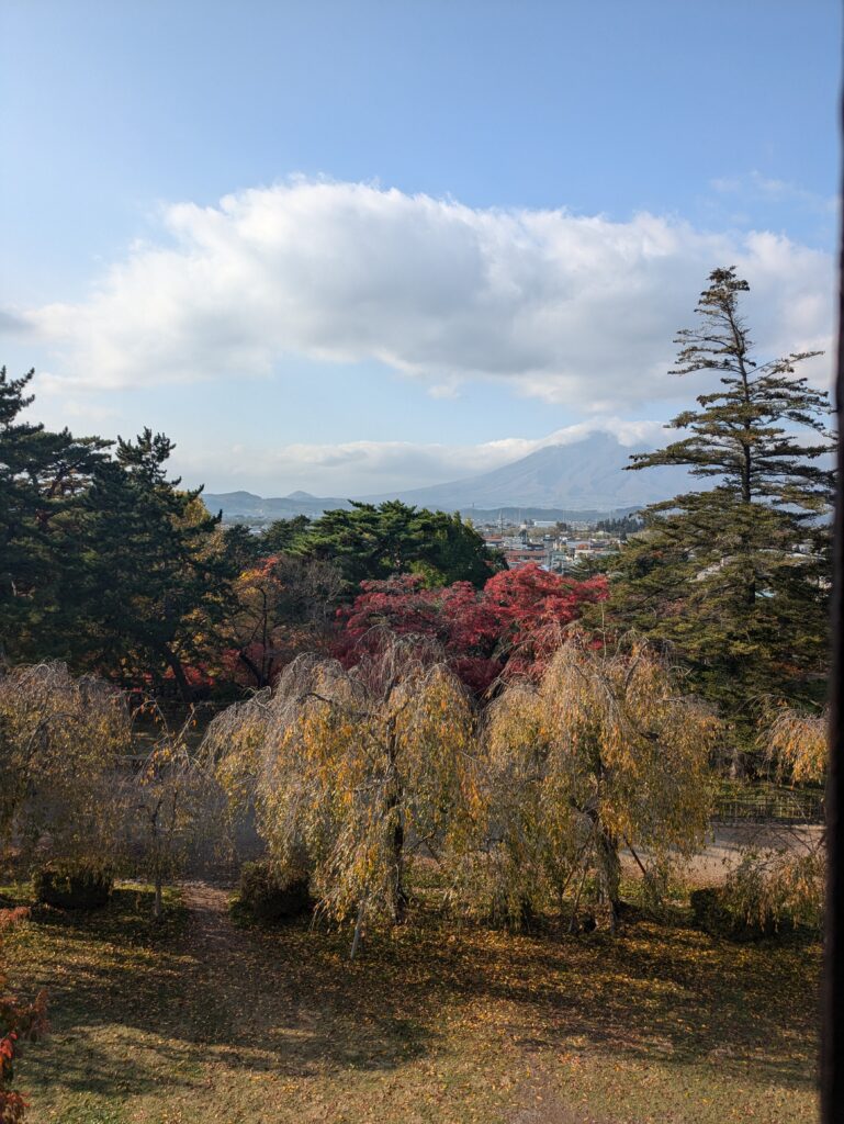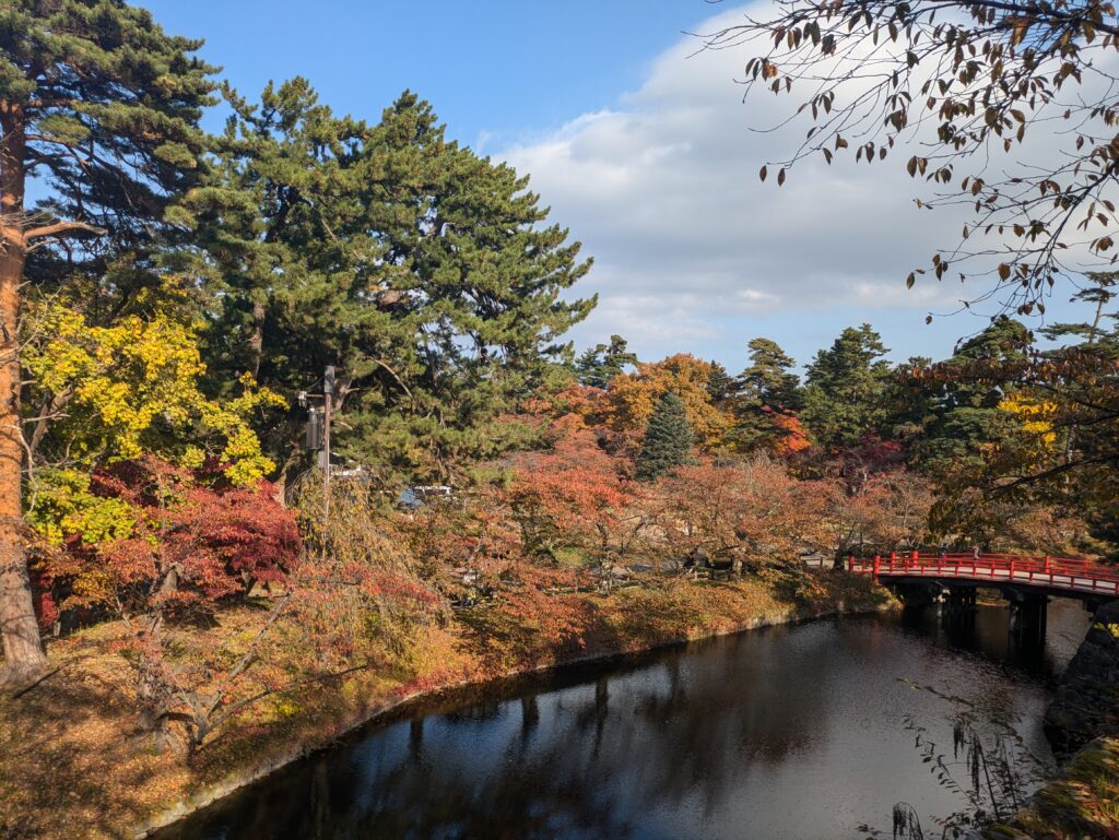 In Shin-Aomori steigen wir in den Local Train in Richtung Akita ein, allerdings steigen wir bereits nach 45 Minuten in Hirosaki wieder aus. Der Zug war recht voll und so konnten wir nicht alle sitzen. In Hirosaki schließen wir unser Gepäck ein und fahren mit dem 100yen Bus zum Stadtpark um doch noch eine Burg auf unserer Reise zu besuchen. Der Park ist geprägt von der schönen Färbung des Herbstlaubs und beherbergt die Überreste einer alten Burg.
