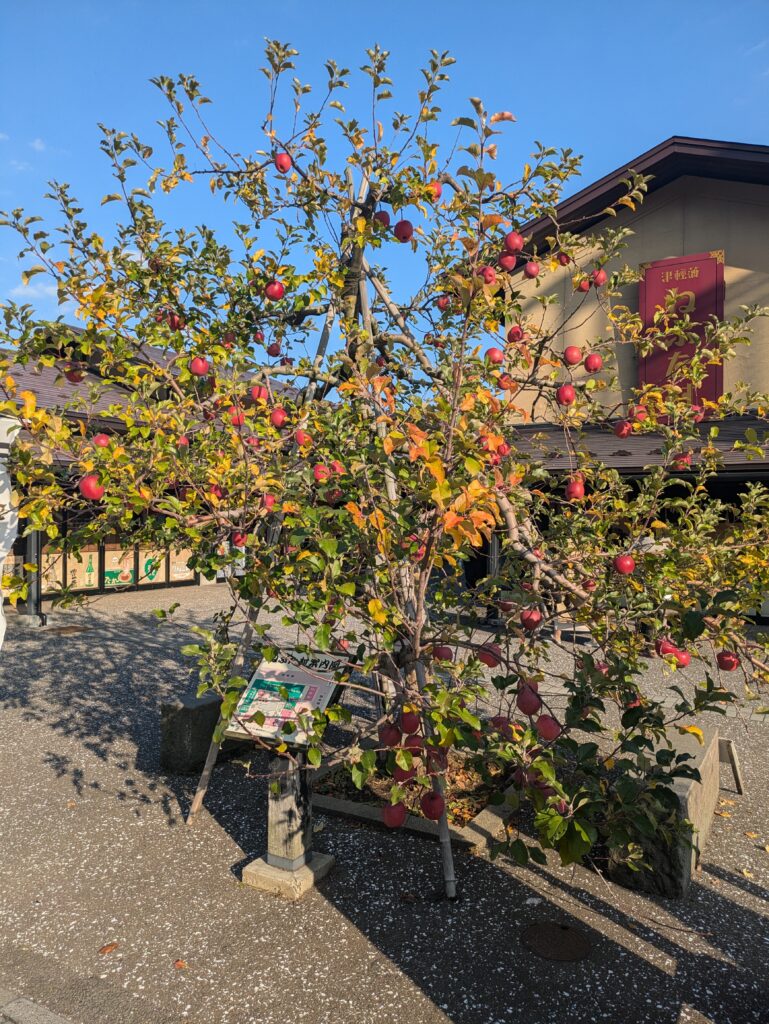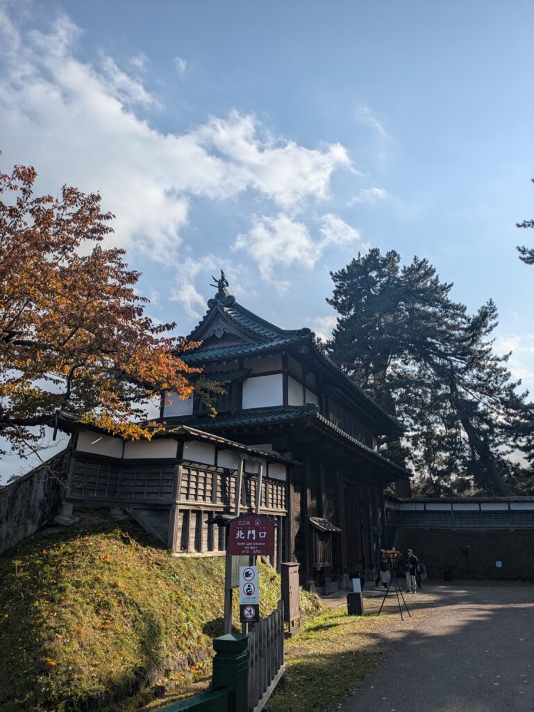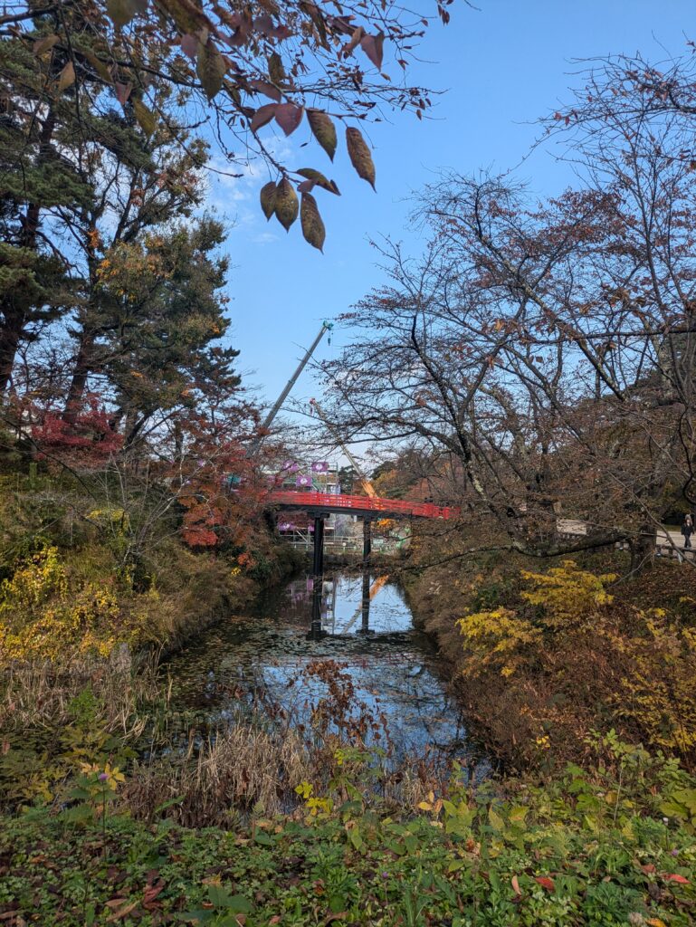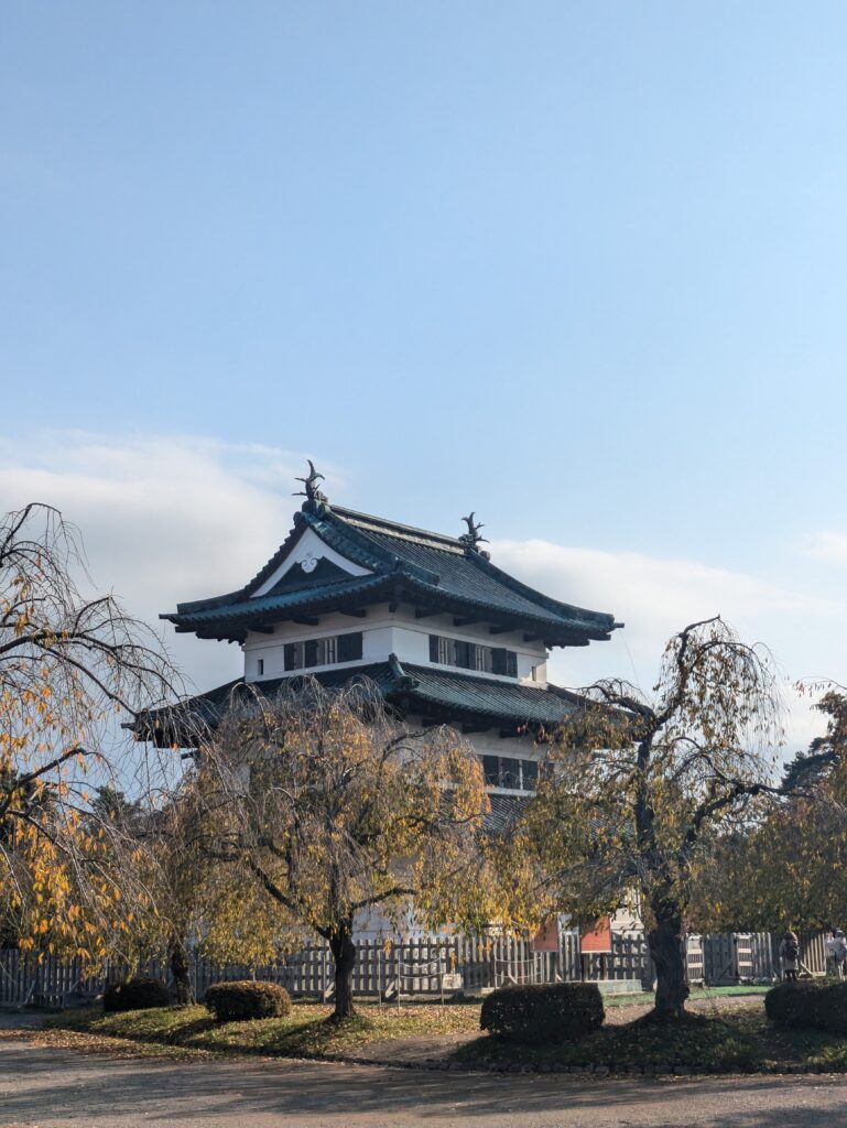 In Shin-Aomori steigen wir in den Local Train in Richtung Akita ein, allerdings steigen wir bereits nach 45 Minuten in Hirosaki wieder aus. Der Zug war recht voll und so konnten wir nicht alle sitzen. In Hirosaki schließen wir unser Gepäck ein und fahren mit dem 100yen Bus zum Stadtpark um doch noch eine Burg auf unserer Reise zu besuchen. Der Park ist geprägt von der schönen Färbung des Herbstlaubs und beherbergt die Überreste einer alten Burg.