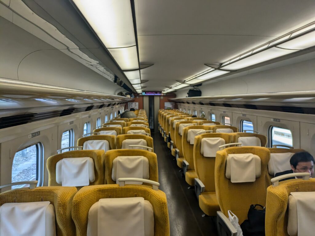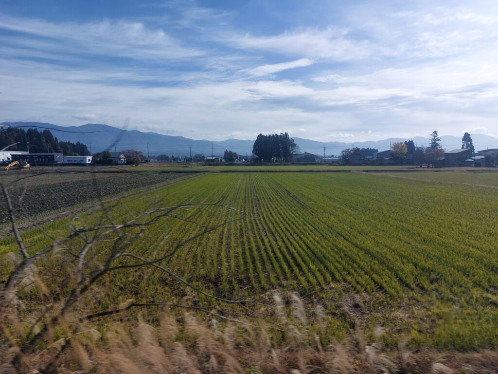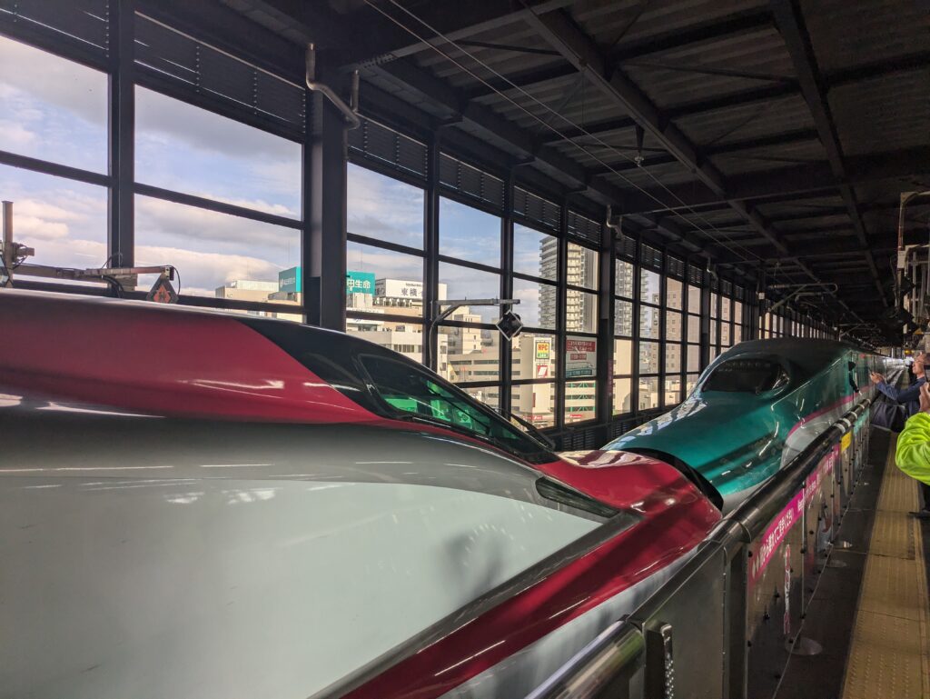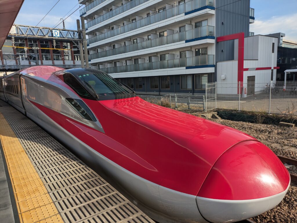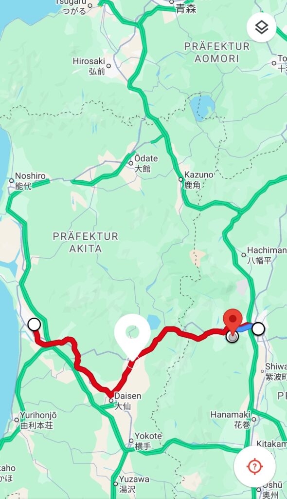 Um 09.12 Uhr geht es mit dem Komachi Shinkansen nach Kakunodate. Dies ist ein Minishinkansen nach Tokyo. Erkennbar daran, dass er nur in 4er Reihen bestuhlt ist (sonst sind es 5er Reihen). Beim losfahren wundern wir uns, warum es plötzlich rückwärts geht. Normalerweise sind die Sitzreihen immer in Fahrtrichtung ausgerichtet. Die Erklärung erfolgt kurze Zeit später. Bis zur 1. Station (Omagari Station) geht es in umgekehrter Fahrtrichtung, danach geht es vorwärts weiter. Auf dem Land gibt es einfach nicht so viele Schienen, so hält dieser Shinkansen zwischendurch auch um Gegenverkehr passieren zu lassen.