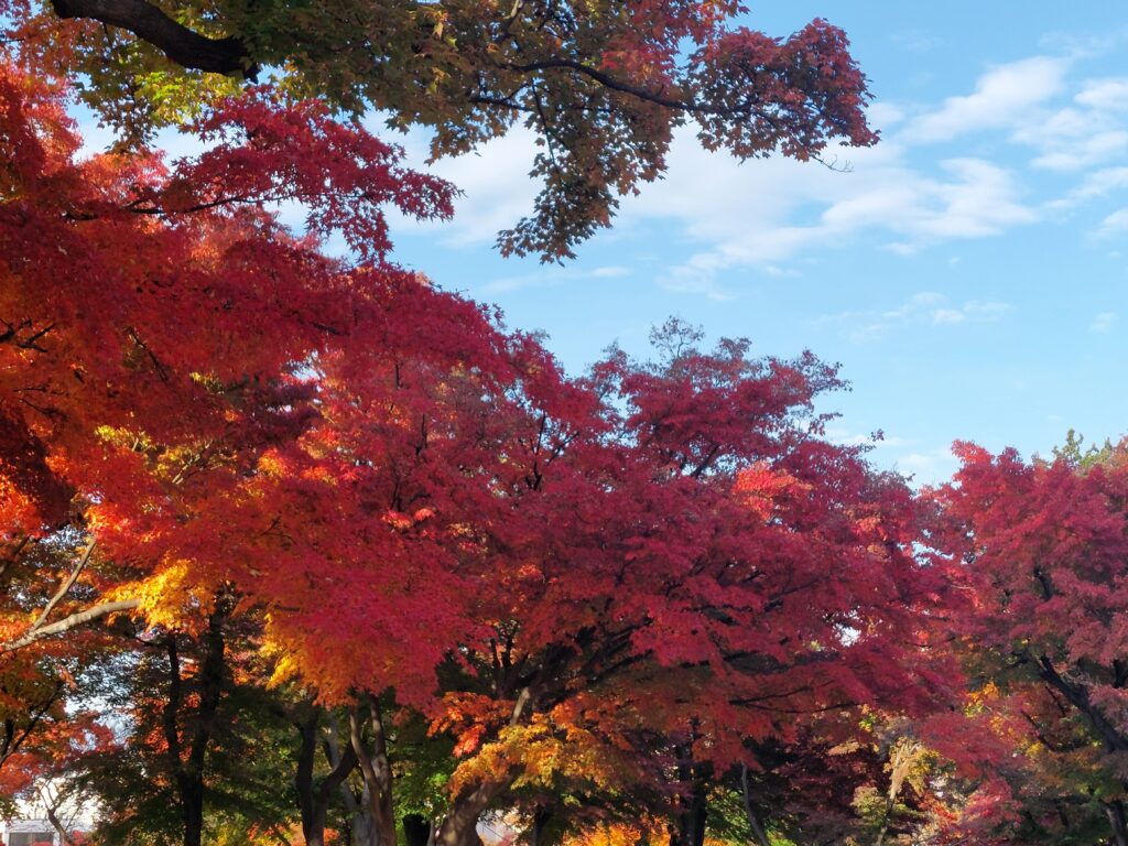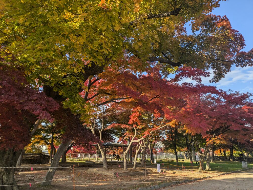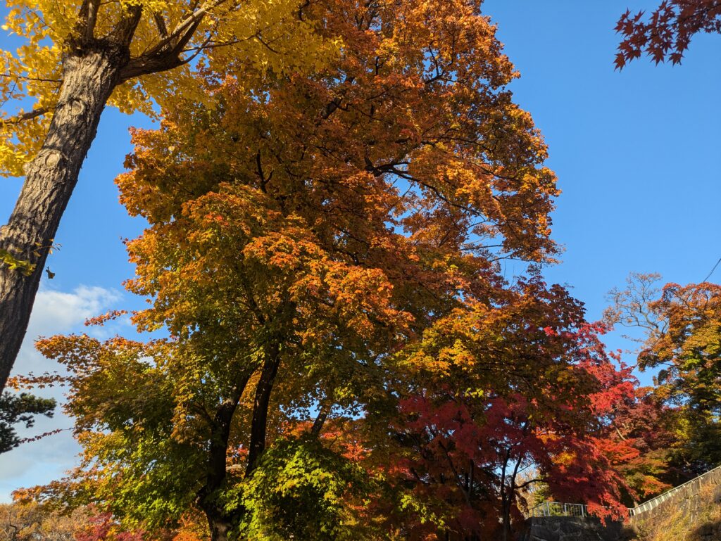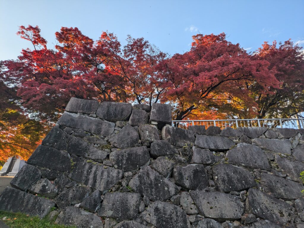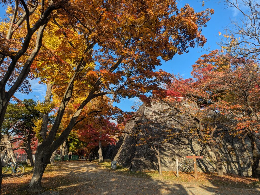 Wir fahren gegen 12.58 Uhr in Kakunodate mit dem Shinkansen los in Richtung Morioka. In Morioka angekommen, wundern wir uns über die schlechte Einfahrt des Zuges in den Bahnhof. Er muss mehrere Male Stop&Go fahren, bis er am richtigen Punkt zum stehen kommt. Beim aussteigen stellen wir fest, dass er zusammengekoppelt wurde. Dann schließen wir wieder unser Gepäck ein und fahren mit dem “Schneckenbus” Dendenmushi zum Stadtpark. Hier erwartet uns eine wunderbare Nachmittagssonne und so können wir die Burgruine im Park sehr genießen. Das Herbstlaub hat auch hier Einzug gehalten, allerdings deutlich weniger als auf der Westseite des Landes.