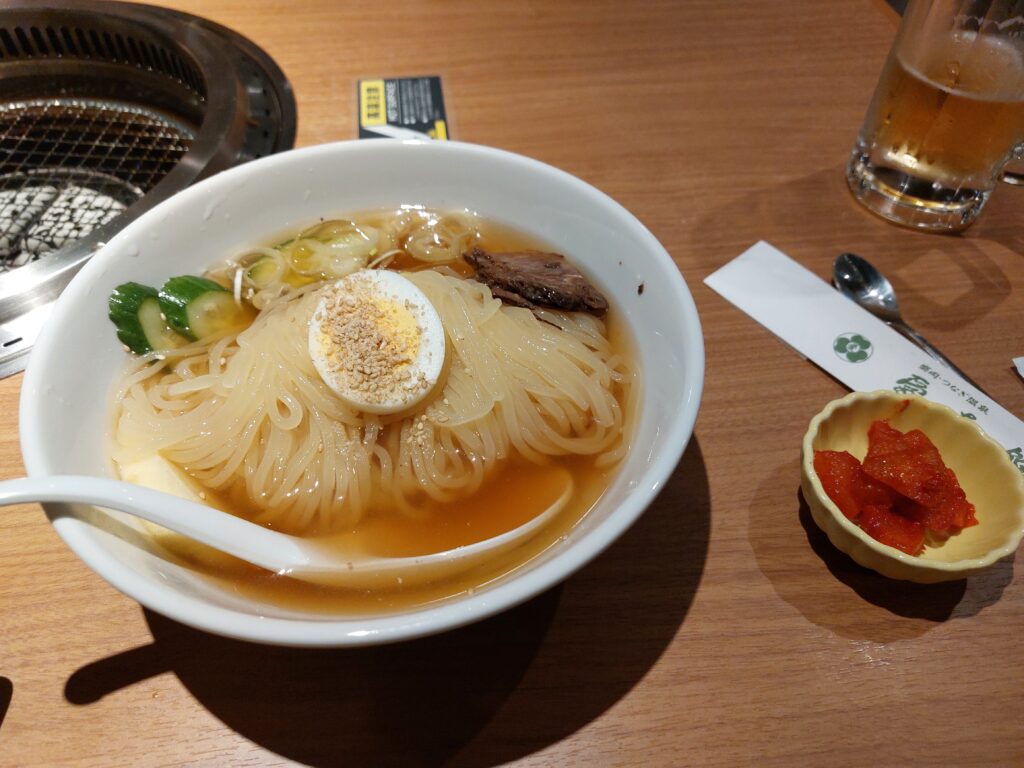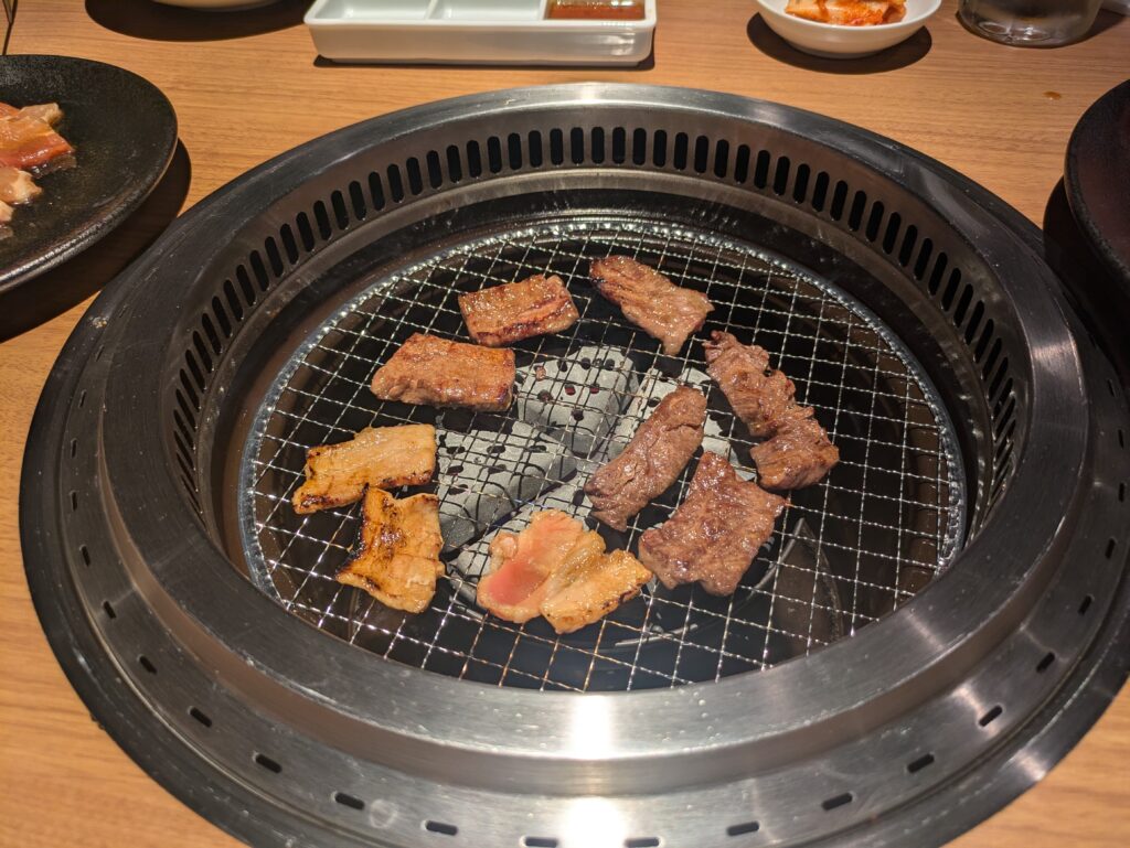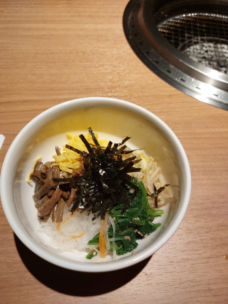 Dort angekommen bezogen wir unser Zimmer und freuten uns auf das Abendessen, obwohl wir nicht genau wissen was es geben wir, jedoch hatten die Essen in den anderen Ryokans immer unsere Erwartungen übertroffen. Wir haben extra den Tag über wenig genascht. Auch dieses Mal war es wieder der Fall. Wir stellten fest, dass wir uns mitten im Landesinneren befinden und so gab es überhaupt kein Fischgericht. Das war besonders, aber nicht weiter tragisch. Stattdessen gab es Yakiniku (verschiedene Fleischsorten auf einem eingelassenen Tischgrill zum selber Grillen, u. a. Wagyu), Reimen (eine Spezialität aus Morioka) sowie Bibimbap (ein koreanisches Reisgericht).