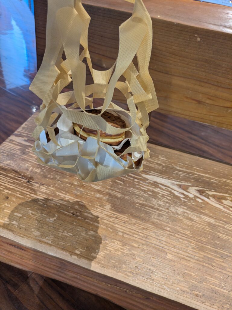 Im Anschluss schlendern wir die O-Dori in Richtung Bahnhof wieder zurück und warten dort ein wenig auf den Bus, der uns nach Tsunagi Onsen bringen soll. Unterwegs gibt es noch eine Süßigkeit in einer eleganten Tragetasche. Was man aus Papier nicht alles machen kann.