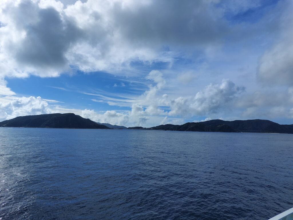 Am Terminal angekommen, haben wir mal wieder eine Punktlandung eingelegt. Kaum stehen wir in der Schlange geht das Boarding los. Pünktlich um 13.15 Uhr verlässt die Fähre den Hafen und wir stechen in See. Thomas ist von den Reisetabletten ziemlich ausgeknockt und verschläft die meiste Zeit, bei Doreen gibt es dagegen keine Nebenwirkungen.