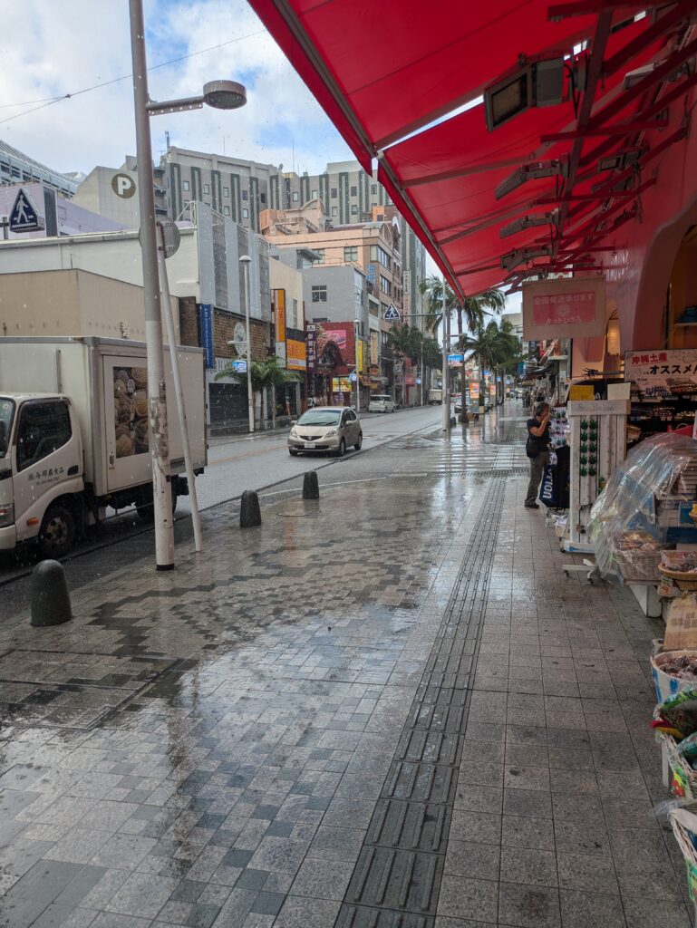 Heute können wir ein bisschen länger schlafen, erst um 08.00 Uhr treffen wir uns zum Frühstück. Danach packen wir und checken aus, glücklicherweise können wir unser Gepäck erstmal hier lassen und so ziehen wir leicht bepackt los. Es ist schon jetzt wieder schwül warm und man hält es problemlos in kurzer Kleidung aus. Allerdings macht uns der Blick auf das Wetter immer mehr Sorgen, sodass wir beschließen, jetzt ist die Zeit gekommen auch einen klassischen japanischen Regenschirm zu kaufen. Diesen finden wir direkt im nächsten Konbini. Es geht wieder durch die Kokusaidori, die im Hellen ganz anders wirkt, am Makishi Fischmarkt vorbei um im Stadtteil Tsuboya das hier sehr starke Töpferei-Handwerk zu bestaunen. Wir schlendern an kleinen Läden vorbei und auf dem Rückweg durch eine Nebenstraße finden wir hier auch noch einige richtige Werkstätten.