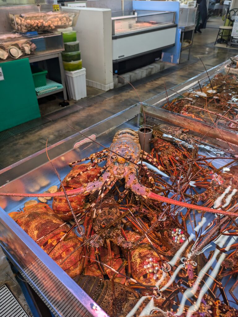 Dann geht es durch den Makishi Fischmarkt, dieses Mal gehen wir rein und bestaunen die großen Hummer, Krebse, Schnecken und Muscheln. Außerdem wird hier der Fubu-Fisch feil geboten.