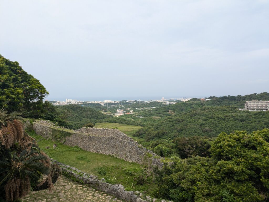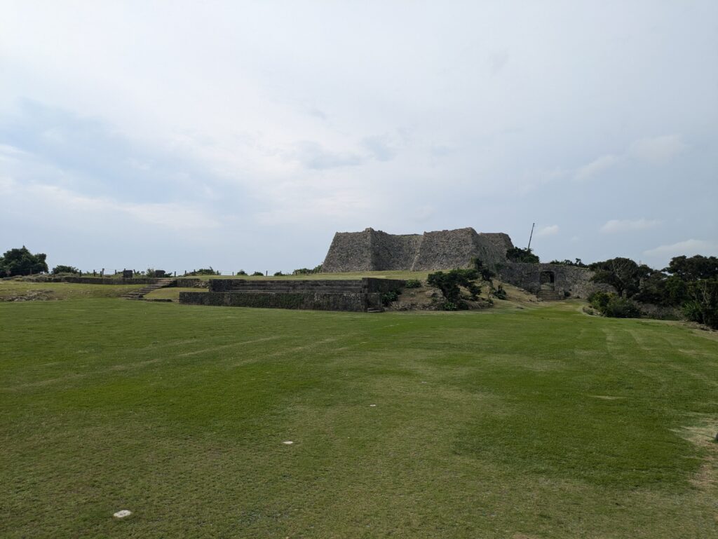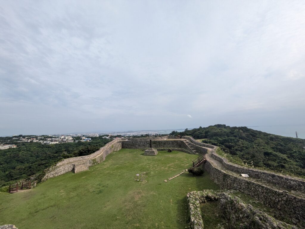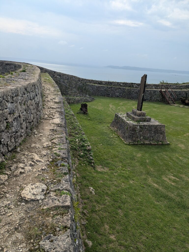 Ein bisschen Rückreisefeeling kommt schon auf, auch, dass unsere Japantour zu Ende geht. Trotzdem lassen wir uns davon nich die Laune verderben und bauen noch einen Zwischenstop auf unserem Weg mit dem Auto zum Flughafen Naha ein. Es geht zur Burg Nakagusuku. Die 2. Beste erhaltene Burg auf Okinawa und UNESCO Welterbe. In der 1. waren wir in Naha schon. Und tatsächlich, sie war noch sehr gut erhalten. Gerade im Mauerwerk konnten wir verschiedene Baustile ausmachen (Nozura-zumi, Tofu-zumi, Kikko Midare-zumi). Außerdem war die geografische Lage so, dass wir sowohl den Pazifik als auch das Ostchinesische Meer sehen konnten.