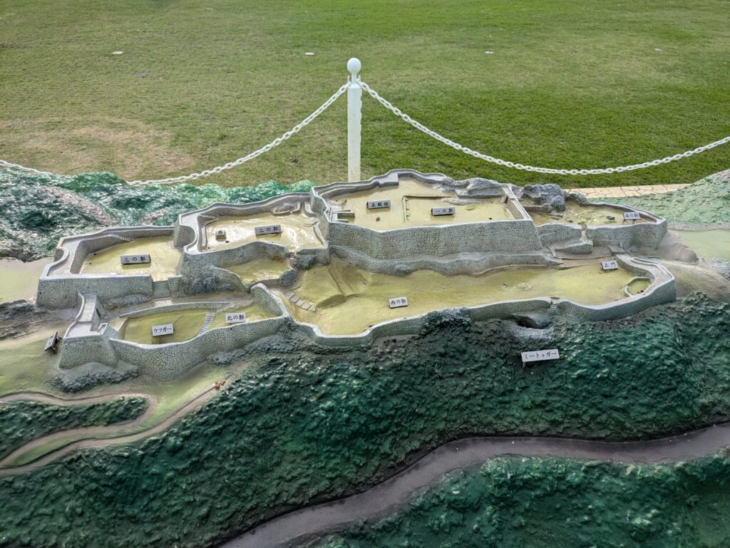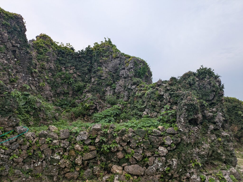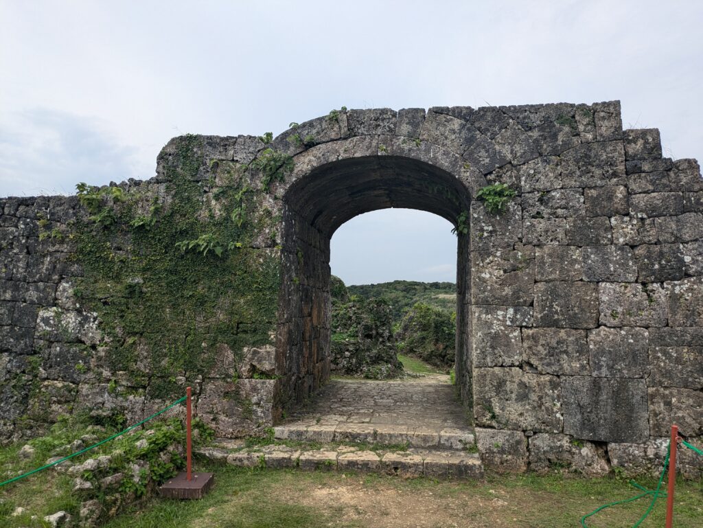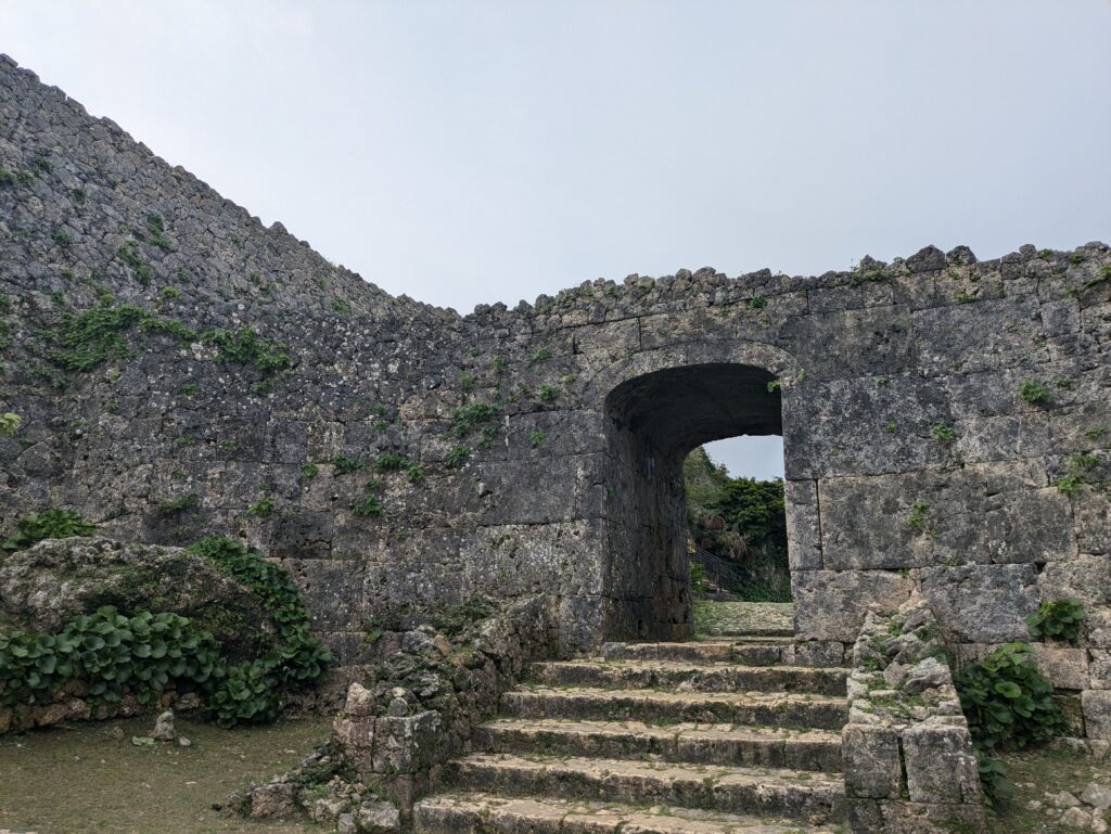Ein bisschen Rückreisefeeling kommt schon auf, auch, dass unsere Japantour zu Ende geht. Trotzdem lassen wir uns davon nich die Laune verderben und bauen noch einen Zwischenstop auf unserem Weg mit dem Auto zum Flughafen Naha ein. Es geht zur Burg Nakagusuku. Die 2. Beste erhaltene Burg auf Okinawa und UNESCO Welterbe. In der 1. waren wir in Naha schon. Und tatsächlich, sie war noch sehr gut erhalten. Gerade im Mauerwerk konnten wir verschiedene Baustile ausmachen (Nozura-zumi, Tofu-zumi, Kikko Midare-zumi). Außerdem war die geografische Lage so, dass wir sowohl den Pazifik als auch das Ostchinesische Meer sehen konnten.