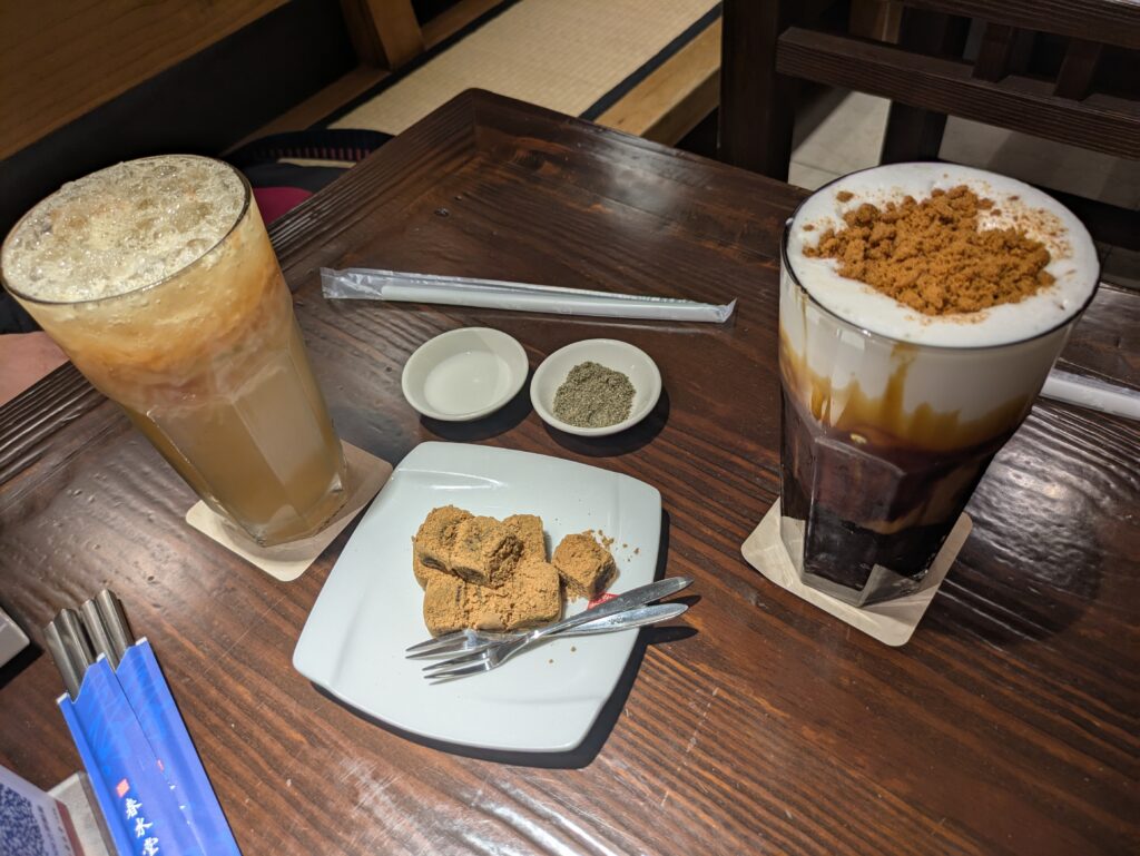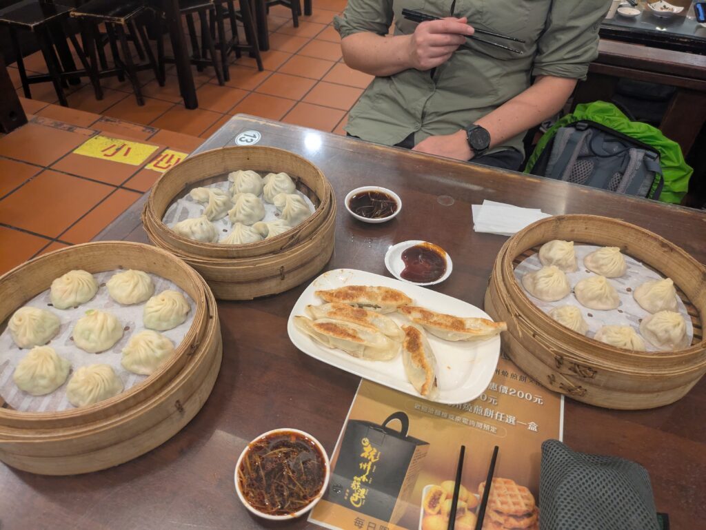 Nach Erkundung des Flughafens fahren wir mit der Metro nach Taipeh und geben unser Gepäck im Hotel ab. Einchecken ist wie erwartet so früh nicht möglich. Wir dürfen uns aber Regenschirme leihen und ziehen los durch unser Viertel. Spontan entscheiden wir uns taiwanesisch zu Frühstücken. Anschließend ging es zur Chiang Kai-Shek Gedächtnis Halle. Als wir wieder draußen waren, wurde der Regen noch stärker und wir entscheiden und für Mittagessen. Es gab leckere Dumplings, eine Spezialität von hier. Gestärkt ging es zum Nachtisch. Bubbletea mit Mochi in braunem Zucker. Ebenfalls eine Kombination, die wir noch nicht kannten.