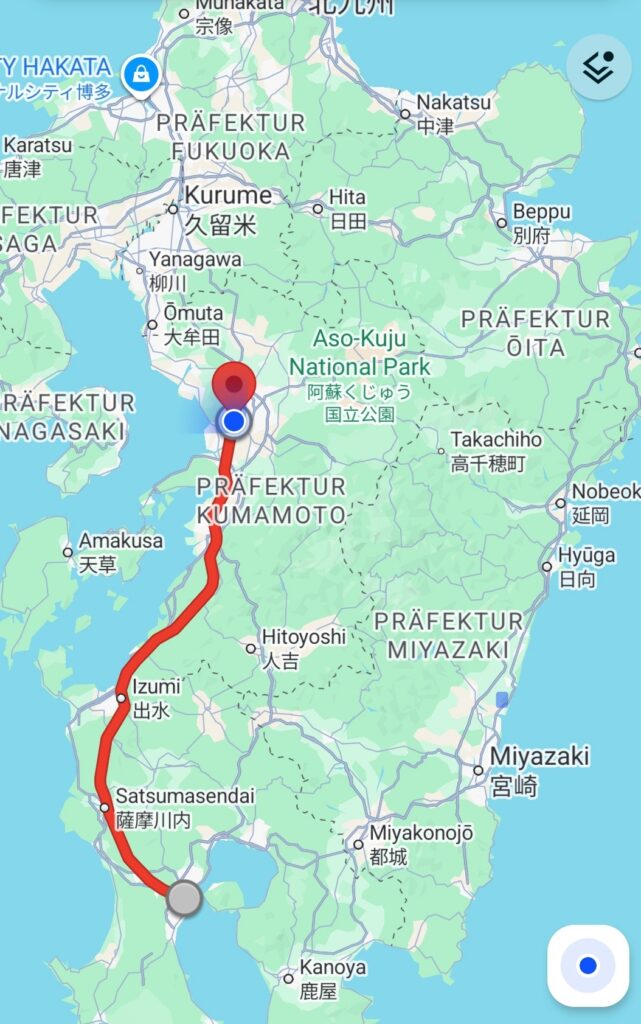 Heute fahren wir das erste Mal in diesem Urlaub Shinkansen. Wie erwartet geht es pünktlich los, durch einige Tunnel hindurch erreichen wir schnell die Reisegeschwindigkeit. Nach nur einem Halt in Sendai kommen wir 45 Minuten später in der Dunkelheit in Kumamoto an.