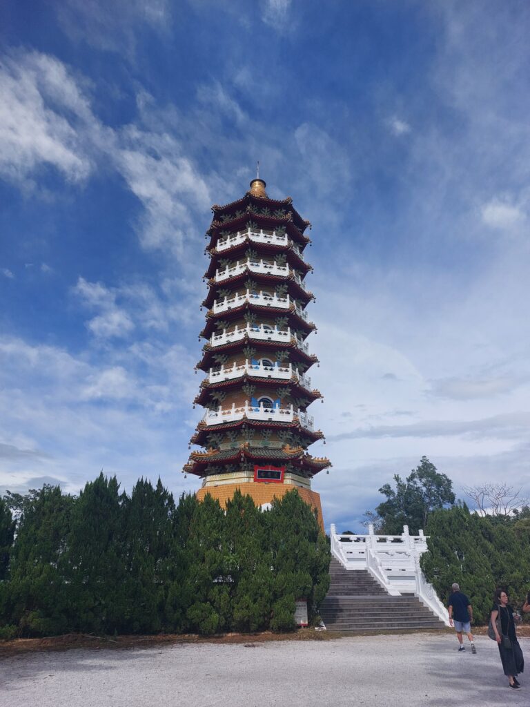 Von dort fahren wir weiter zum Xuanzhuang Tempel, den wir ebenfalls in Augenschein nehmen. Unterwegs kommen wir noch am Tutingzai Ausblick vorbei den wir gerne mitnehmen. Kurz nach dem Tempel geht es ein Stück den Berg hoch, die Ci’en Pagode erwartet uns. Die restlichen 570 Stufen bis zur Pagode gehen wir dann über den sogenannten Trail nach oben. Es handelt sich eher um einen gut ausgebauten gepflasterten Fußweg mit regelmäßigen Stufen. Die 5 stöckige Pagode lässt sich sogar besteigen und so genießen wir oben einen tollen 360° Ausblick über die grünen Berge und den türkisen See.
