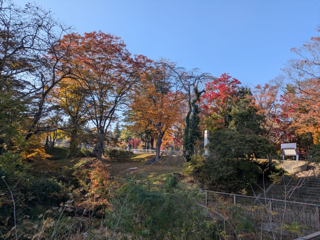 Wir fahren gegen 12.58 Uhr in Kakunodate mit dem Shinkansen los in Richtung Morioka. In Morioka angekommen, wundern wir uns über die schlechte Einfahrt des Zuges in den Bahnhof. Er muss mehrere Male Stop&Go fahren, bis er am richtigen Punkt zum stehen kommt. Beim aussteigen stellen wir fest, dass er zusammengekoppelt wurde. Dann schließen wir wieder unser Gepäck ein und fahren mit dem “Schneckenbus” Dendenmushi zum Stadtpark. Hier erwartet uns eine wunderbare Nachmittagssonne und so können wir die Burgruine im Park sehr genießen. Das Herbstlaub hat auch hier Einzug gehalten, allerdings deutlich weniger als auf der Westseite des Landes.