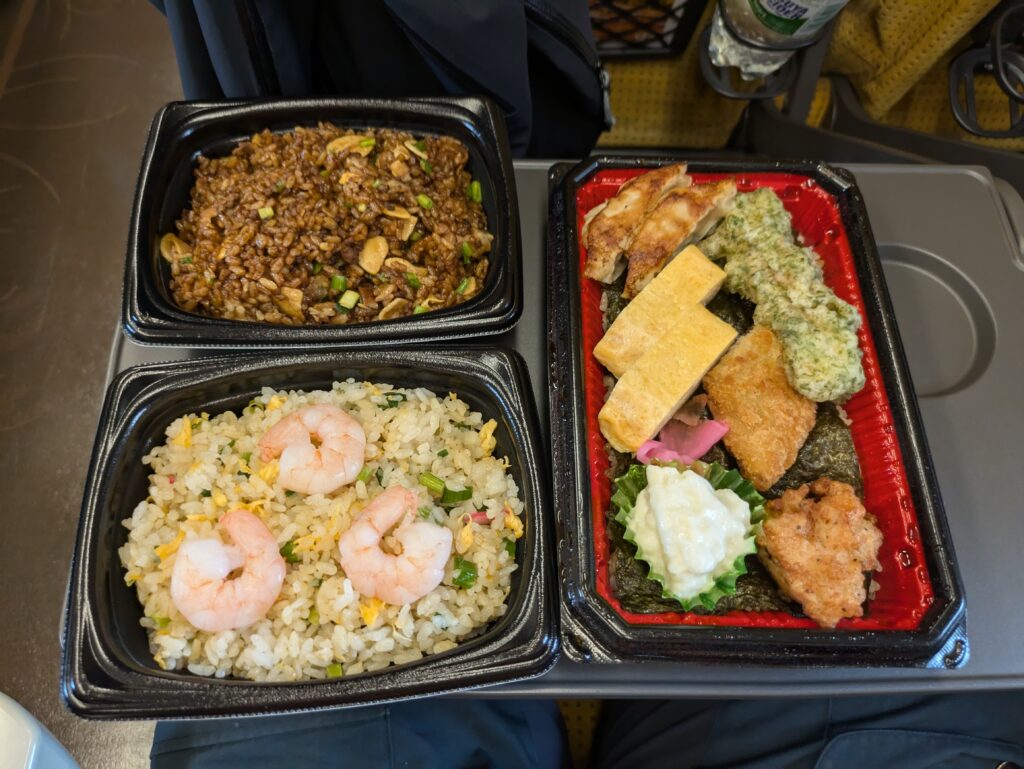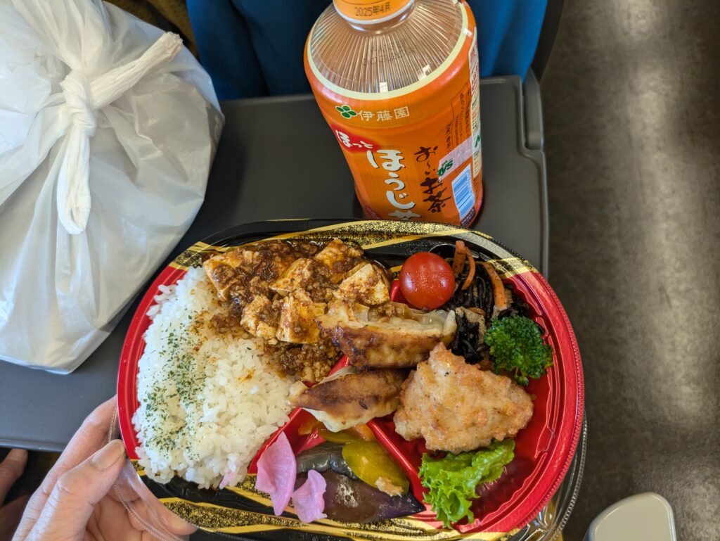 Von hier gehen wir den Burgberg hinab und folgen der Einkaufspassage zum Bahnhof zurück. Dabei lassen wir uns etwas treiben und beobachten die Leute und die Läden. Am Bahnhof angekommen besorgen wir uns noch ein Mittagessen in Form einer Bento-Mischung und fahren um 14.31 Uhr weiter nach Tokio. Auf der Fahrt lassen wir uns das Essen schmecken und schaffen es kaum die Landschaft, die mit 320km/h an uns vorbei fliegt, zu genießen.