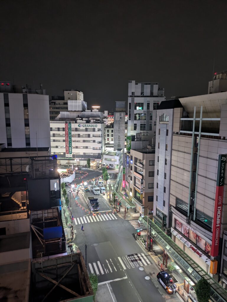Beim Verlassen des Zimmers schlägt uns auf dem Outdoor Flur ein kalter Wind entgegen. In Tokio ist es deutlich kühler geworden. Die Baustelle auf der Straße von gestern Abend ist bereits komplett abgebaut.